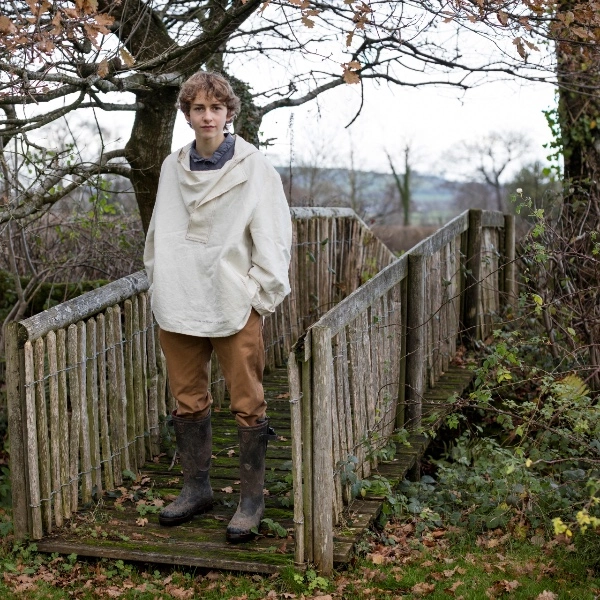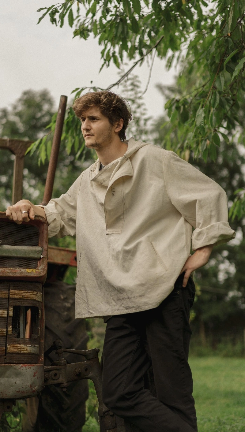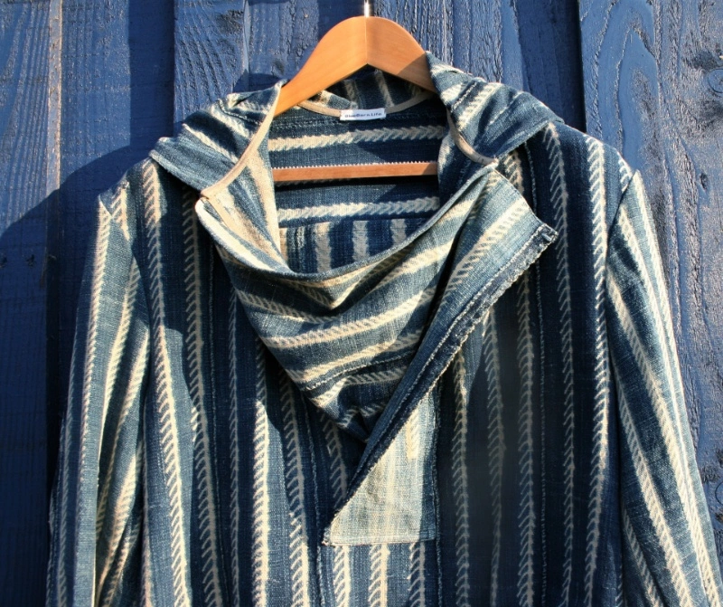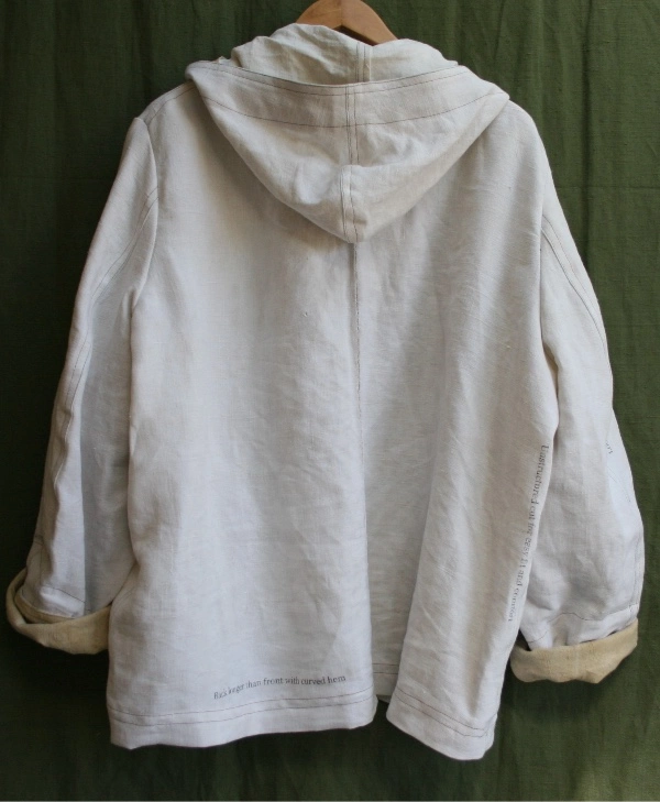 Pull-on jacket with two slit (welt) pockets, a hood and a storm-flap. The design is based on an old canvas jacket with the name Walter embroidered inside, perhaps by a young sailor’s mother.