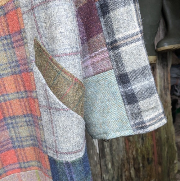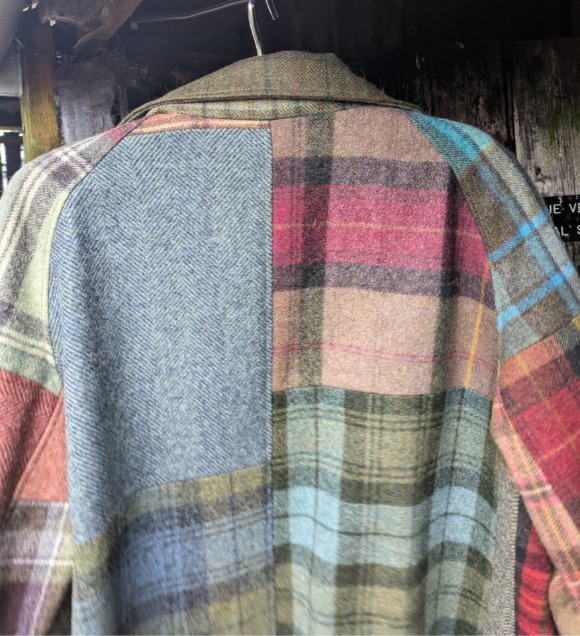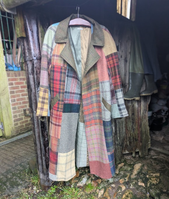 Show-stopping long overcoat whose design is based on one from the 1940s (think Humphry Bogart). It has a wide collar and lapels, large welt pockets, a deep back vent, raglan sleeves and wide sleeves. It is fully lined in silk. The coat is made from a patchwork of Yorkshire tweeds in checks and plaids, A heritage piece that we hope will last through generations.