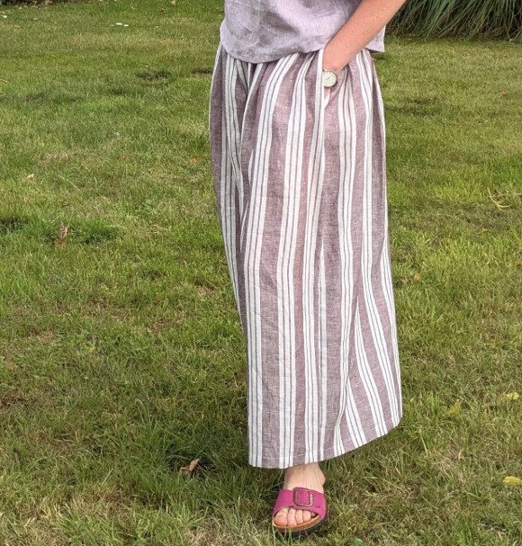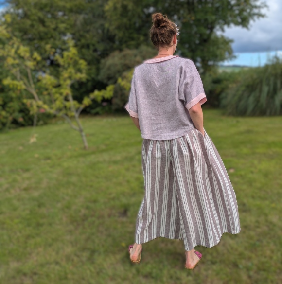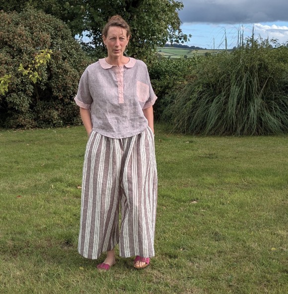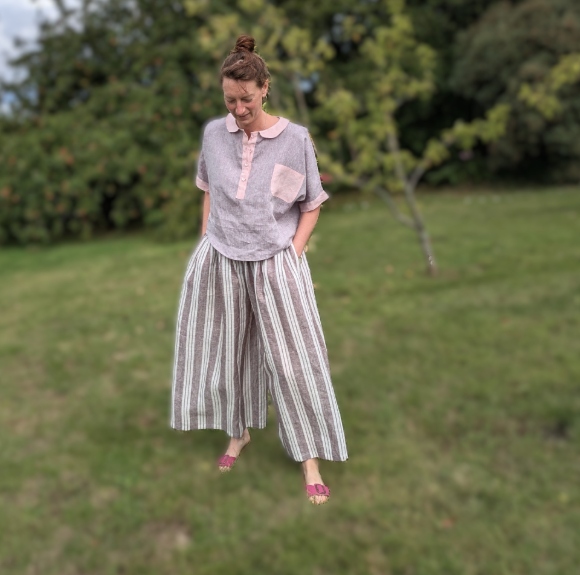 Pull-on culottes with wide legs and side pockets. They are pleated into a fully elasticated waistband. The fabric is a lightweight Irish linen in broad stripes. Shown here is the pretty blouse with Peter-Pan collar.