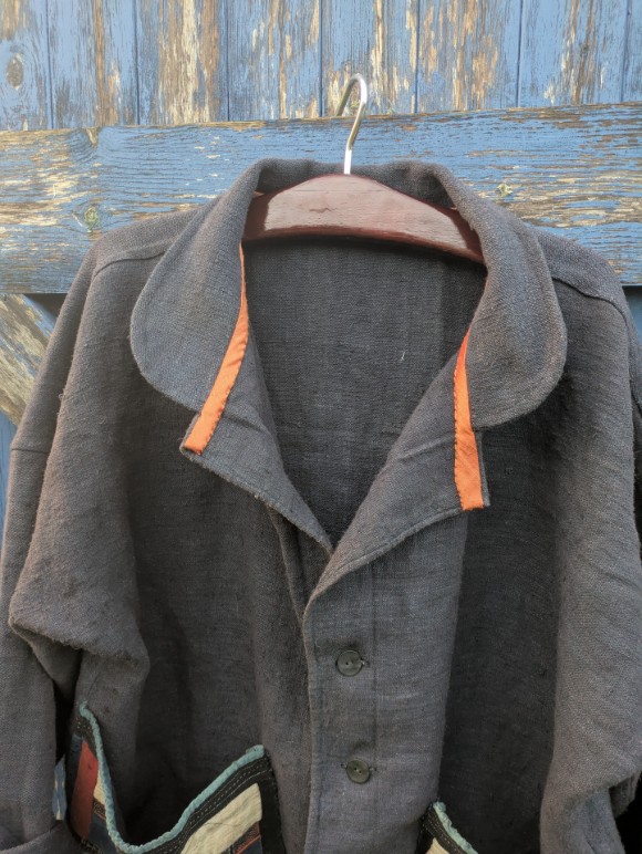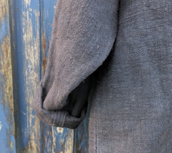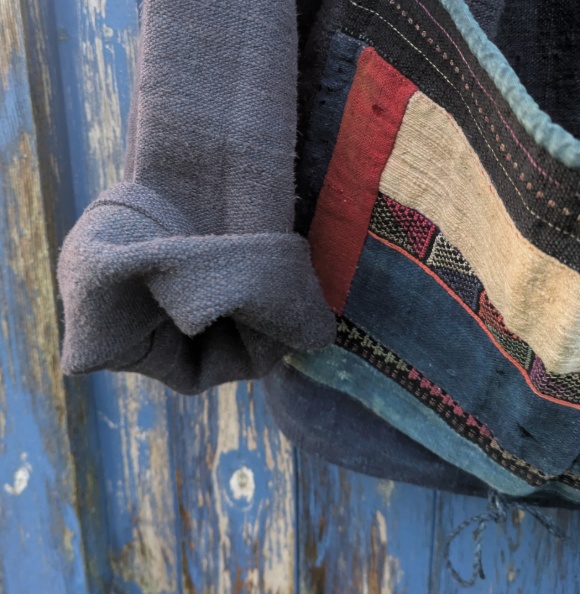 Slouchy, kimono style jacket with dropped shoulders, wide sleeves rounded collar and large patch pockets made from two patchwork embroidered scraps that we think were traditional leggings from the Far East. The jacket is made from heavy antique linen that has been hand-dyed using indigo. The jacket is unlined.