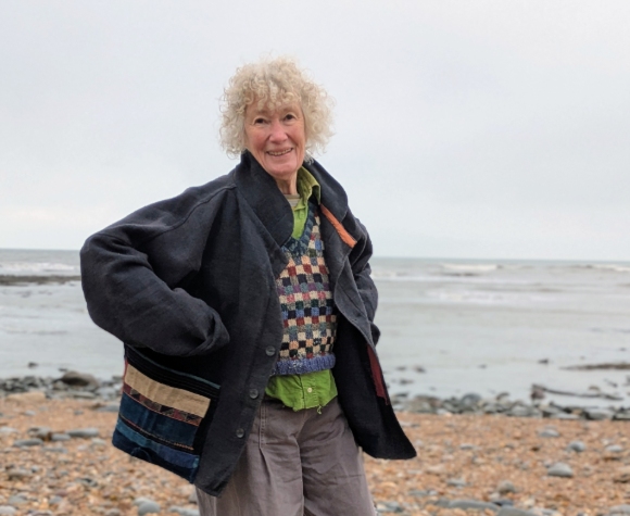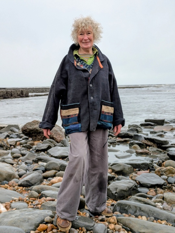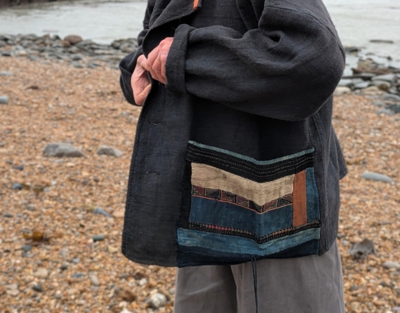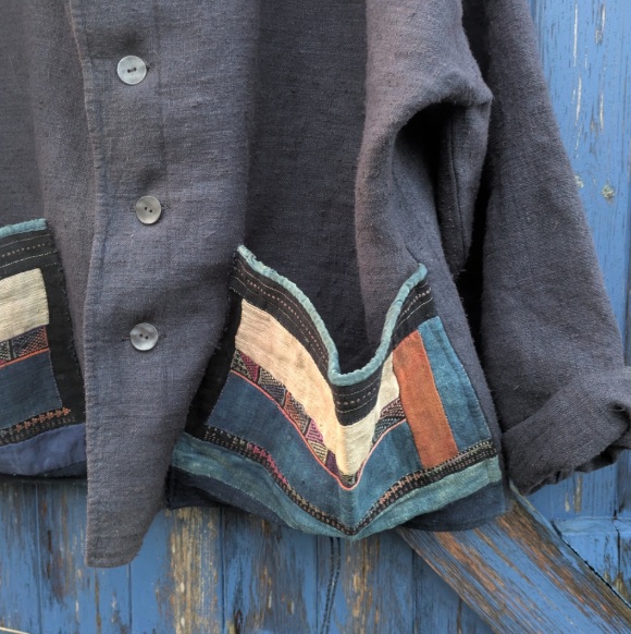 Slouchy kimono-style jacket with dropped shoulders, wide sleeves a roulded collar and large patch pockets made from pieces of fine patchworked fabric that we believe were once traditional leggings from the Far East. The jacket is unlined,made from heavy antique linen that has been hand-dyed using indigo.