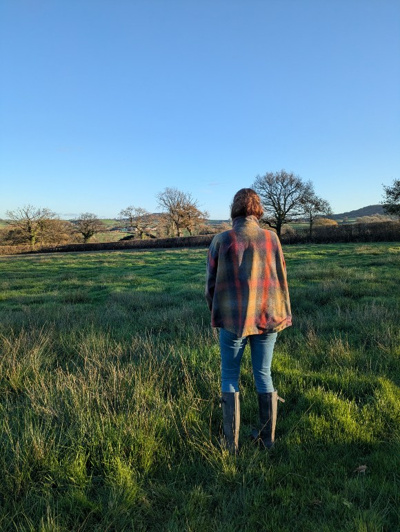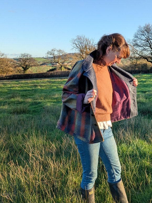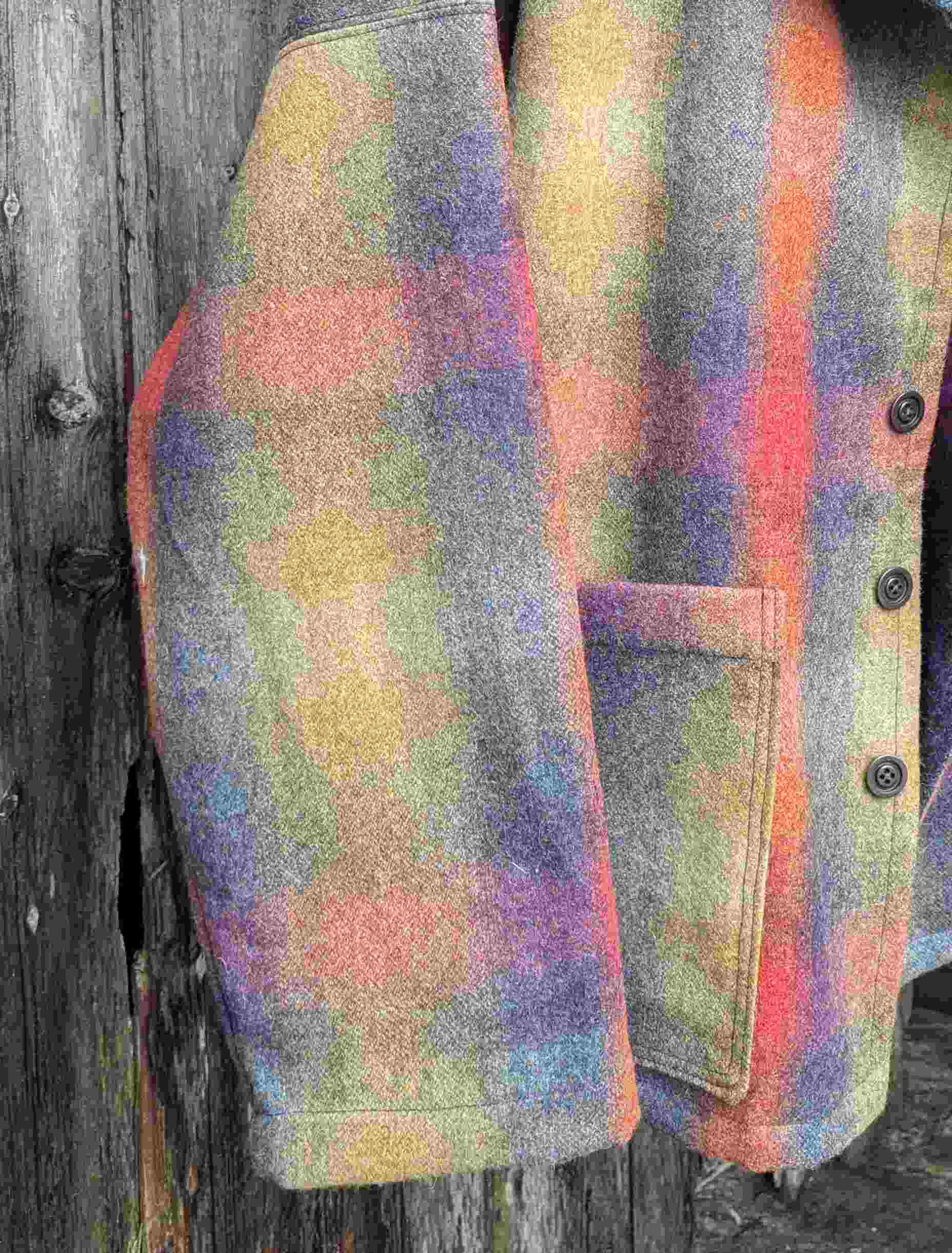 kimono style jacket in vintage tweed and lined in a purple silk featuring patch pockets on the front and fastens with vintage buttons down the centre front.
