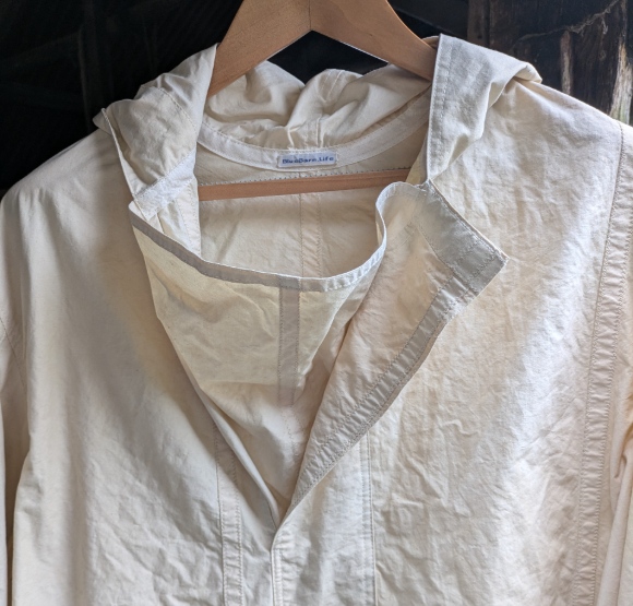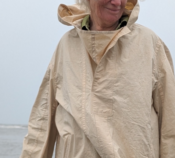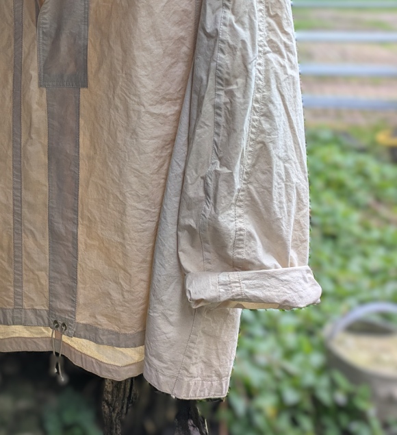 The design of this jacket is based on an old sailor's jacket we found. It has a hood, a placket with storm flap, wide sleeves and welt (slit) pockets. It is made from an antique cotton sail so it has several unexpected seams all beautifully sewn. It is unlined. Perfect for a day at the seaide (although it is not waterproof).