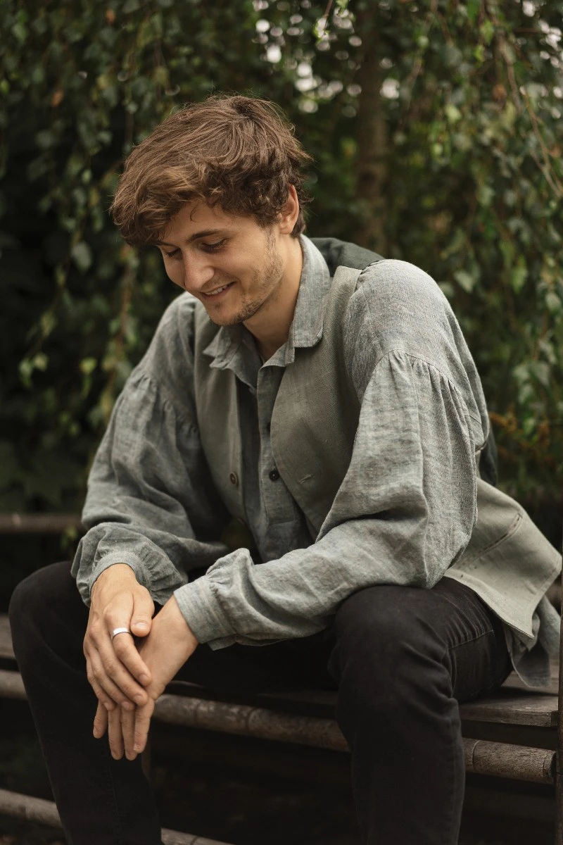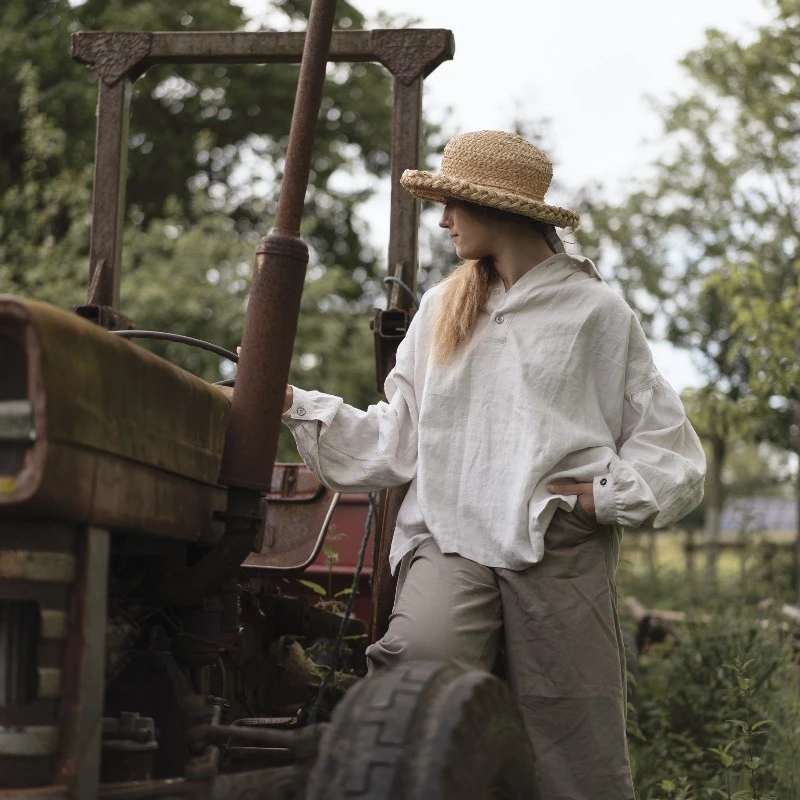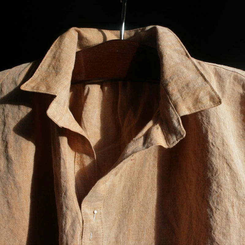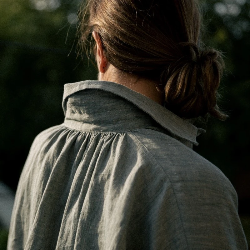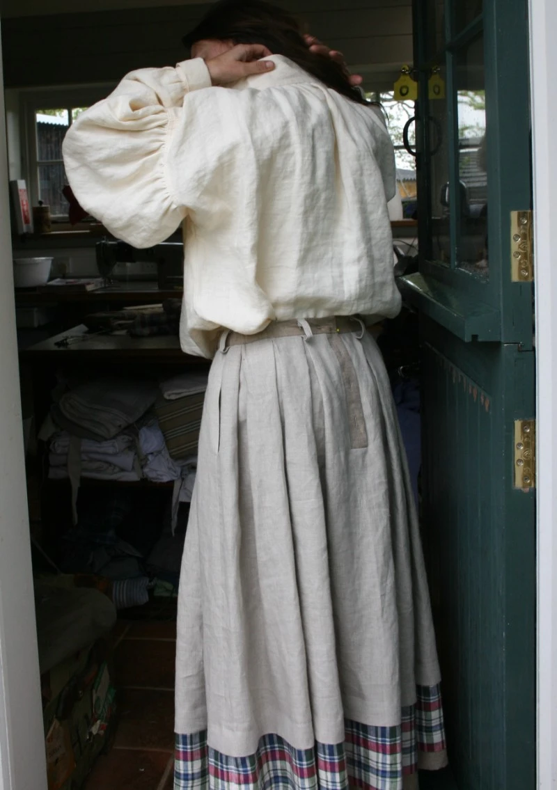 The shirt is gathered at the cuffs, shoulders and collar. Pull-on style with a small collar and cuffs. We usually make these shirts in fine Irish linen.