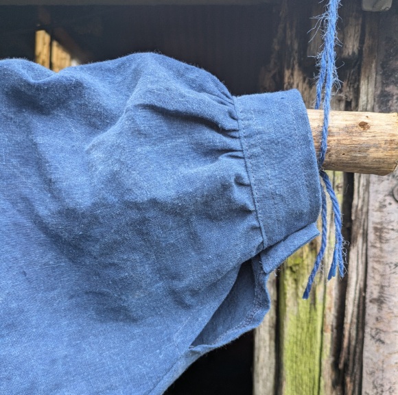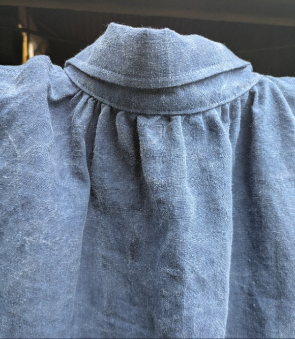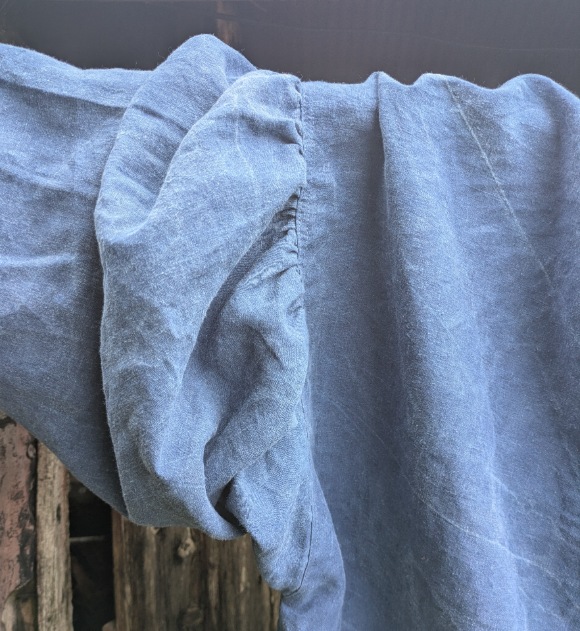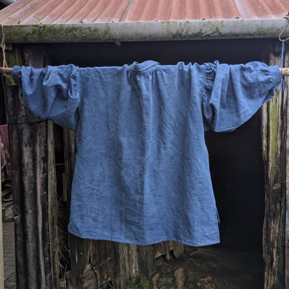 Oversized shirt in the style of the 18th and 19th centuries (think Ross Poldark) in a heavy vintage indigo linen. This pullover style is gathered at the shoulders, collar and cuffs and has a longer hem at the back with small splits on either side.