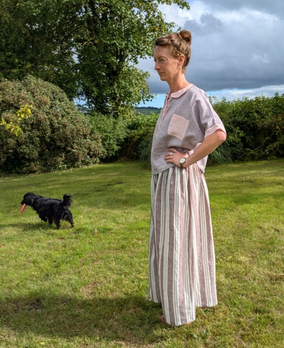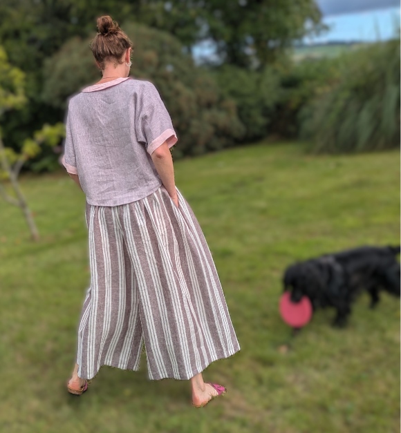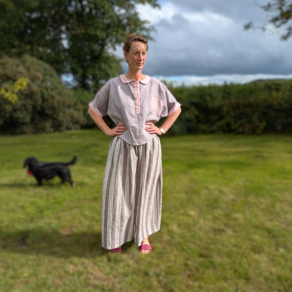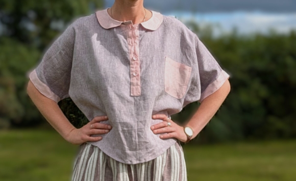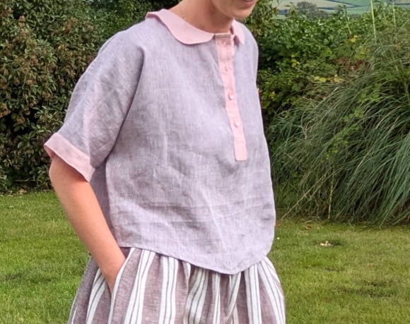Pullover blouse with round neck and Peter-Pan collar, dropped shoulders and grown-on half-sleeves and top pocket. Made from violet Irish linen with sugar pink highlights, the placket is closed with pink vintage buttons. Shown here worn with striped culottes.