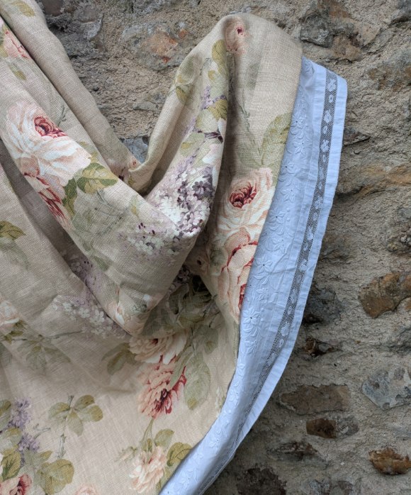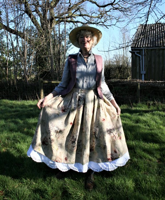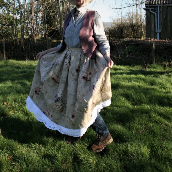 A full skirt in floral linen with box pleats into the waistband. The design is inspired by the wonderful costumes of the 2019 film Little Women. There is a panel of antique lace around the hem. This design features pockets in the side seam and fastens at the back with a placket and buttons. the waist size is adjustable with elastic in the sides. Please note that the photos showing someone wearing the skirt are an earlier version with a different lace trim.