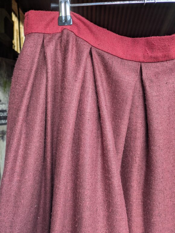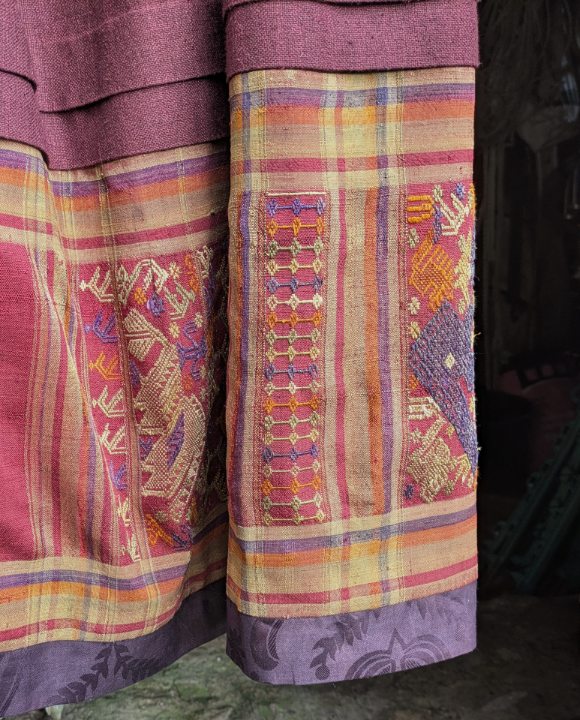 Raw silk skirt featuring box pleats into the contrast waistband and a back placket. The skirt has pockets in the sides. This design fastens with buttons at the back and has elastic in the sides for a more adjustable waist. The skirt is embellished with a broad panel of richly embroidered handwoven vintage silk and a contrast trim at the bottom in deep aubergine figured cotton.