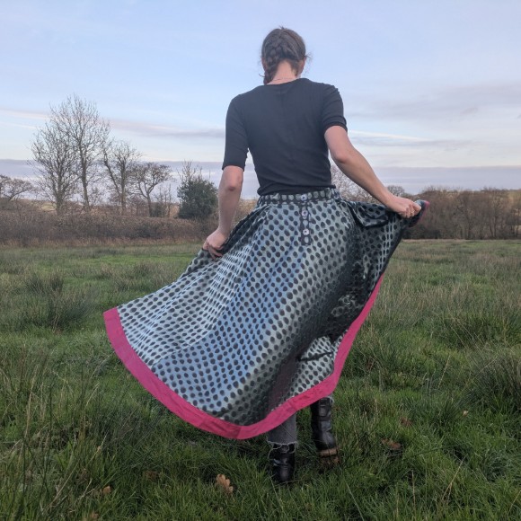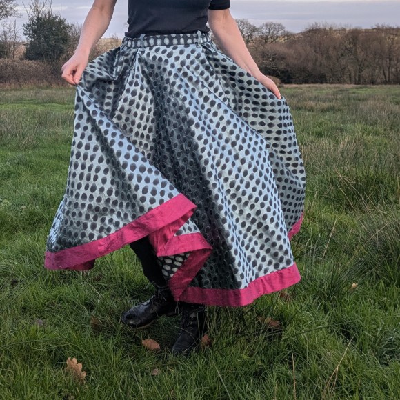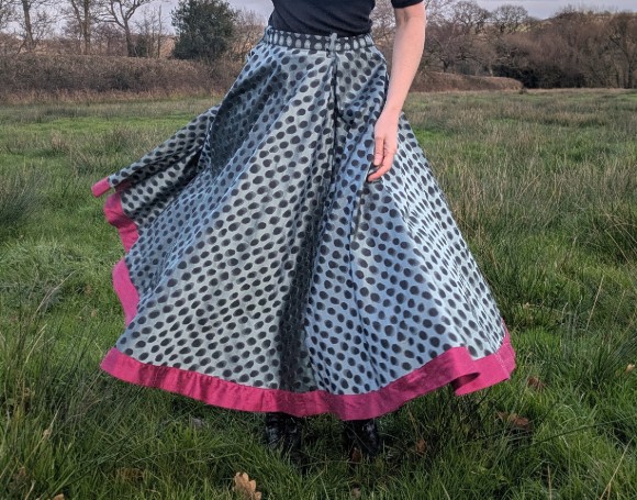 A circular skirt inspired by the designs of the 1950s in a beautiful blue iridescent dotted fabric with a contrasting hem in shocking pink silk. The skirt has a back placket closed with unique vintage buttons. The waistband is adjustable with elastic in the sides and has belt loops.