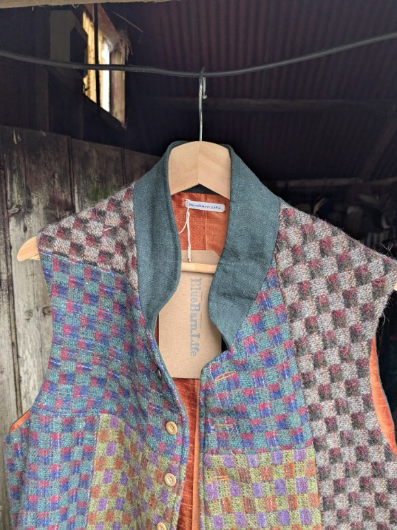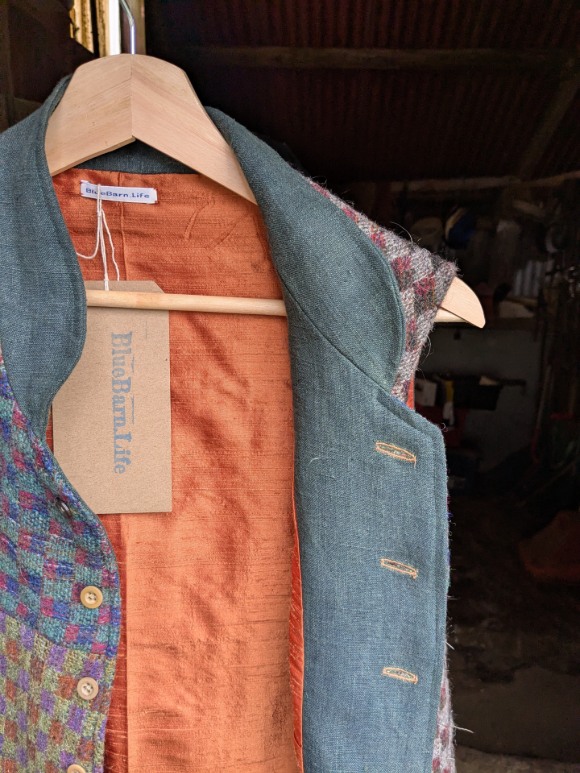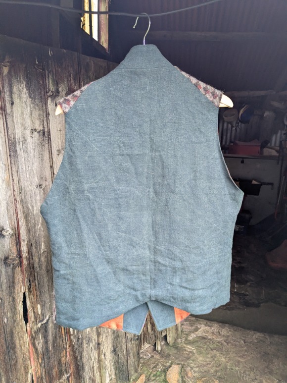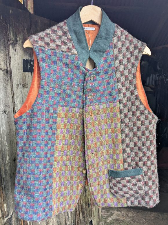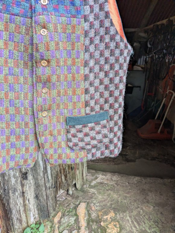 Patch-worked waistcoat made from handwoven Scottish wool with back panel and facings in vegetable dyed vintage linen. Lined in a vintage silk with a patch pocket detail on the front and a selection of vintage buttons down the centre front.