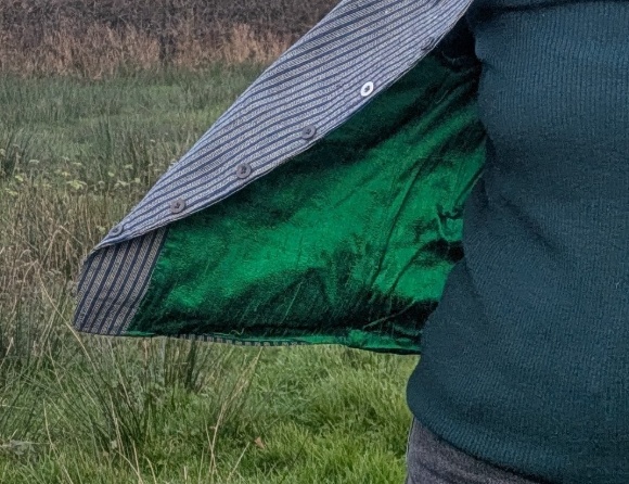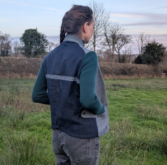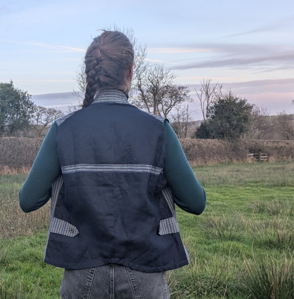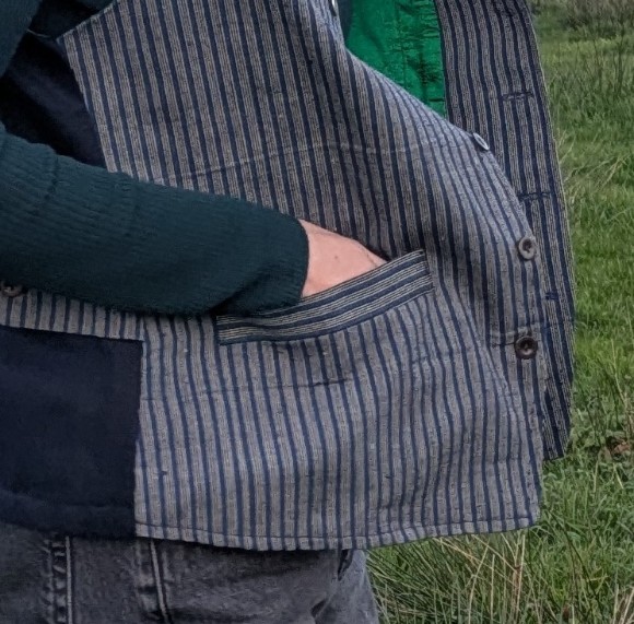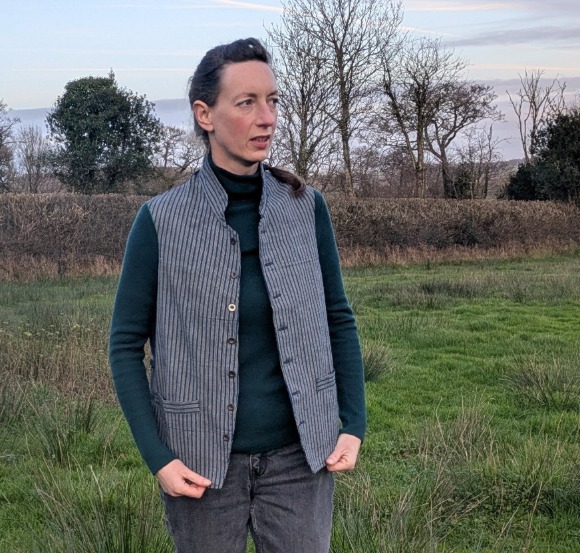 Casual waistcoat in handwoven indigo stripe with contrasting green silk lining. Features two welt pockets on the front with a selection of vintage buttons to close the waistcoat.